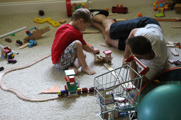 At some point, late morning, I head down the stairs, still feeling numb, in a haze, life surreal. I peek down the basement steps to see J (who’s taken the day off work) with C Bear, playing choo-choo trains. My heart warms at the sight; such a good daddy my boys have.